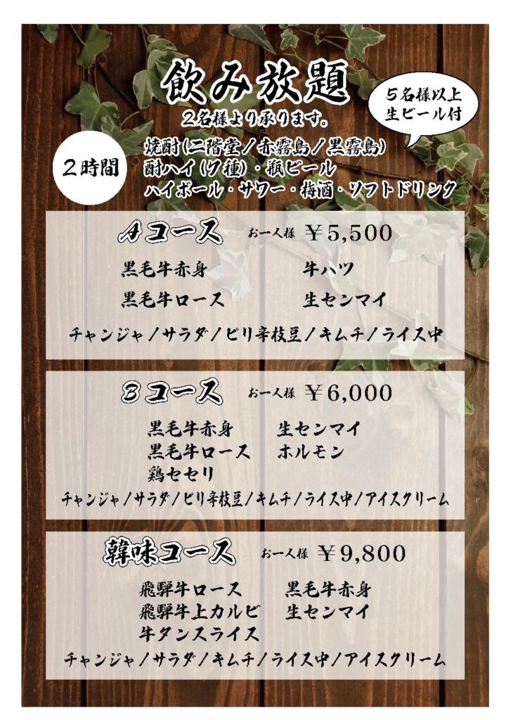 | 飲み放題内容 焼酎(二階堂/赤霧島/黒霧島)酎ハイ(7種) ※5名様以上生ビール付 | |